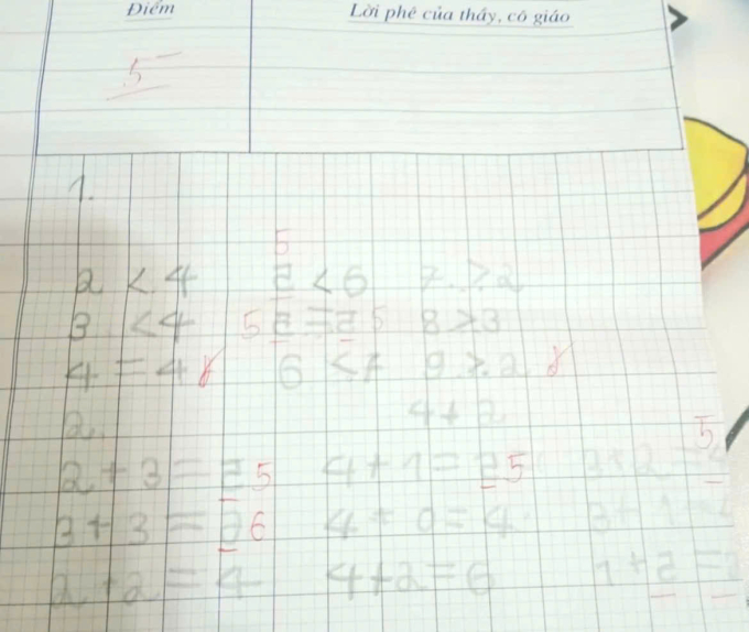 "Trẻ em lớp 1, làm phép tính đúng hết nhưng chữ số viết ngược có nên chấm điểm cho cháu thấp như thế này không?" - Đây là thắc mắc của một phụ huynh gây sốt mạng xã hội những ngày gần đây. Người này đính kèm bài kiểm tra của con mình. Trong đó, con chị bị chấm sai 6 phép tính. Thay vì viết kết quả là số 5, số 6 như thông thường, học sinh này viết ngược. Tổng bài kiểm tra em được 5 điểm.