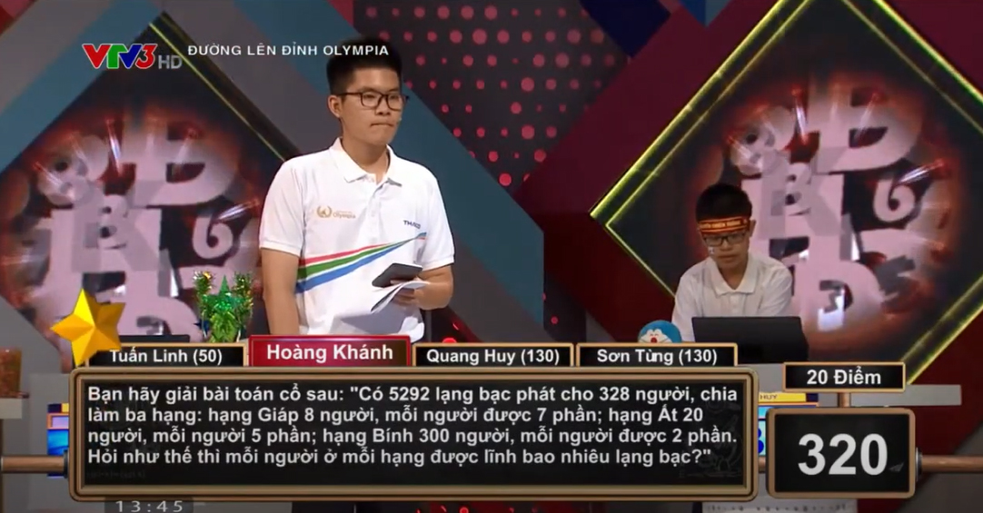 Như mới đây, xuất hiện câu hỏi trong trận Quý 1 Đường Lên Đỉnh Olympia đã gây khó dễ cho cả 4 thí sinh: "Có 5292 lạng bạc phát cho 328 người, chia làm 3 hạng: Hạng Giáp 8 người, mỗi người được 7 phần; hạng Ất 20 người, mỗi người được 5 phần; hạng Bính 300 người, mỗi người được 2 phần. Hỏi như thế thì mỗi người ở mỗi hạng được lĩnh bao nhiêu lạng bạc?".