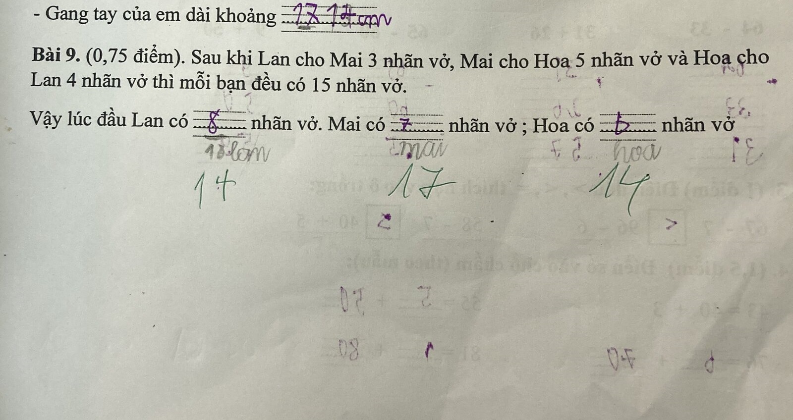 Vậy lúc đầu Lan có 14 nhãn vở; Mai có 17 nhãn vở; Hoa có 14 nhãn vở.