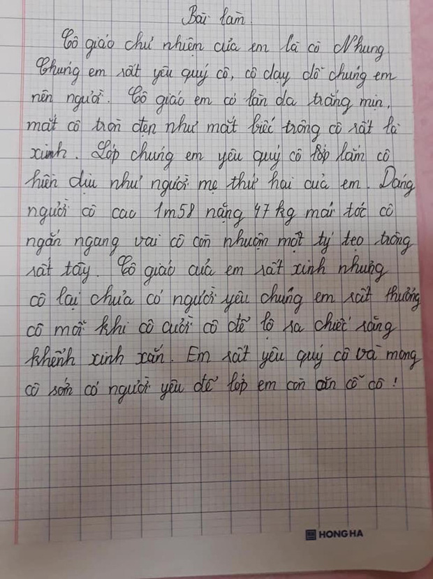 Học sinh tả cô có làn da trắng mịn, đôi mắt tròn đẹp như mắt biếc, dáng cô mảnh khảnh, mái tóc ngắn nhuộm một tẹo trong rất Tây. Cô bé khẳng định cô mình rất xinh nhưng vội "bóc phốt" cô chưa có bồ. Học trò này cũng không quên mong cô sớm có người yêu để cả lớp còn... đi ăn cỗ!