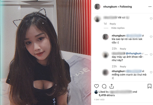 Một vài người bạn đã để lại bình luận thể hiện cảm xúc bất ngờ, choáng váng đến không tin nổi vào bức ảnh Nhung Bum trang điểm khá đậm, diện chiếc áo phông khoét ngực khoe vòng 1 gợi cảm. Cô nàng đành thú thật rằng: "Vì miếng cơm manh áo thôi mà". Bởi hình ảnh ấy mang tính chất minh hoạ khi Nhung Bum PR cho một loại thức uống giúp tăng kích cỡ vòng 1.