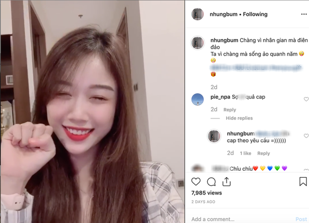 Trước đó 1 ngày, cô nàng cũng từng đăng một video với lời dẫn cực sến sẩm để PR cho một app chụp ảnh: "Chàng vì nhân gian mà điên đảo. Ta vì chàng mà sống ảo quanh năm". Khi bị bạn bè đặt dấu hỏi về độ mùi mẫn mà cô nàng viết, Nhung Bum thừa nhận rằng mình chỉ đăng bài theo yêu cầu.