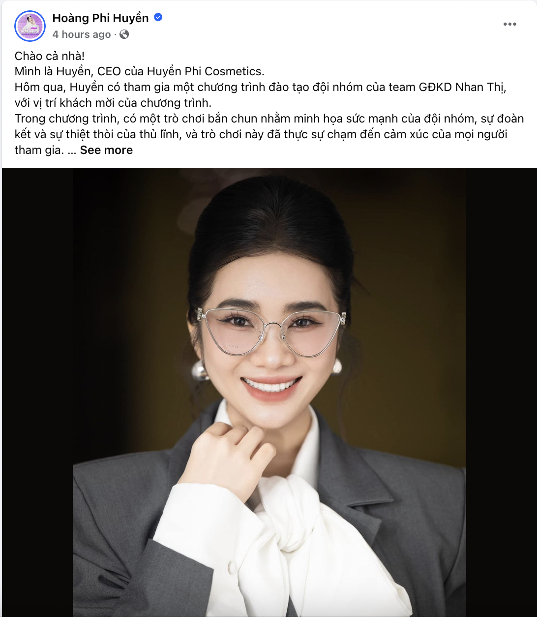 Theo đó, chị Huyền cho biết, "Hôm qua, Huyền có tham gia một chương trình đào tạo đội nhóm của team GĐKD Nhan Thị, với vị trí khách mời của chương trình.