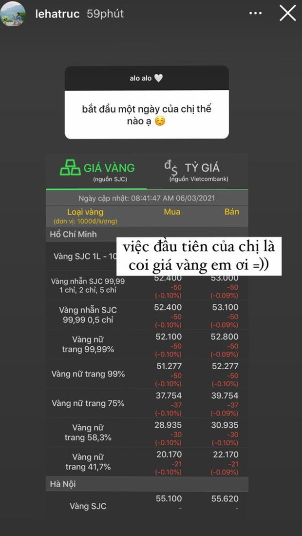 Ngoài ra, Hà Trúc cũng tiết lộ thói quen "chanh sả" mỗi buổi sáng: mở coi giá vàng.