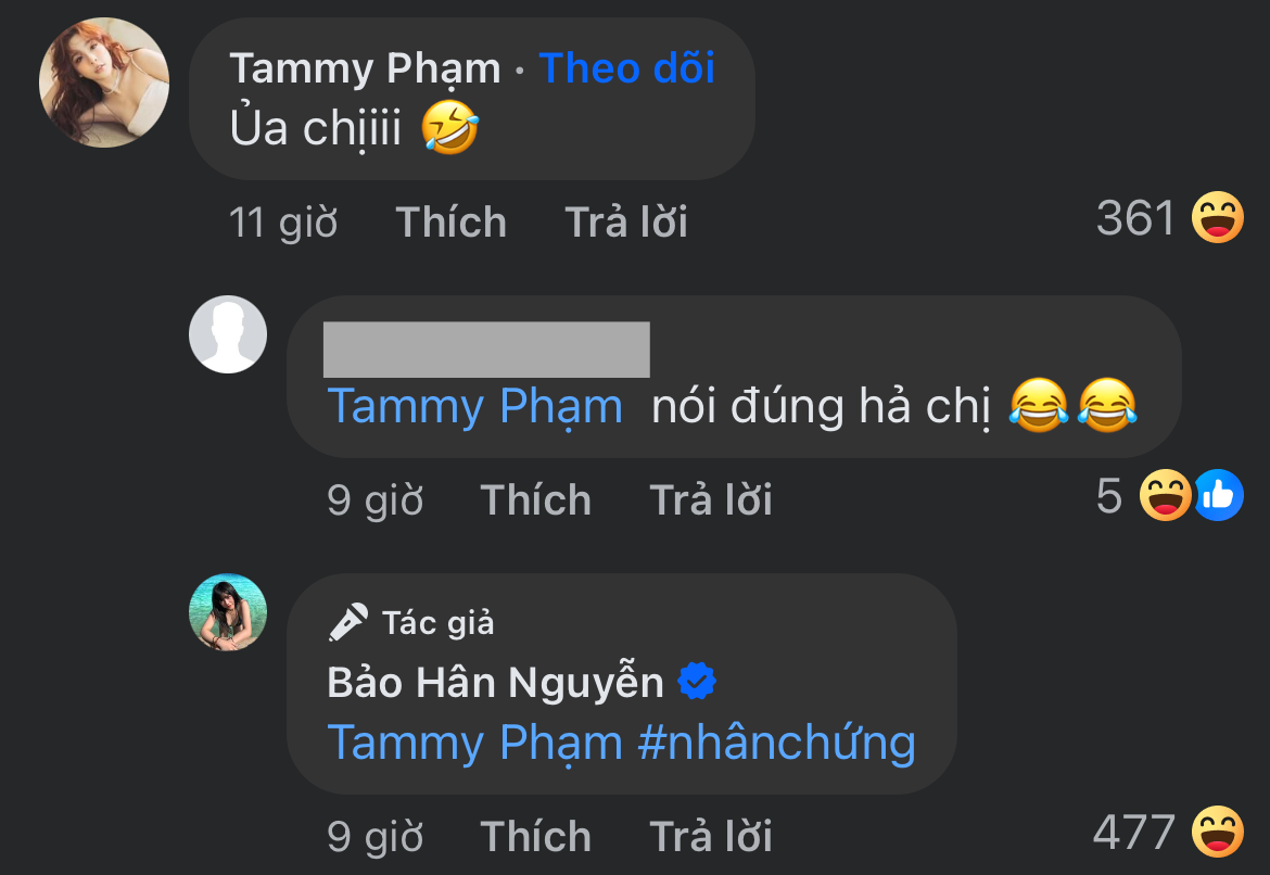 Ngay lập tức, không chỉ netizen mà nhiều gương mặt thân quen cũng có mặt ngay phía dưới bài đăng, trong đó có Tammy Phạm - bạn gái cũ B Ray. Gái xinh TikTok này giật mình: “Ủa chị!” và Bảo Hân đáp lại ẩn ý: “#nhânchứng”. Dù không nói nhiều nhưng câu trả lời của Bảo Hân khiến nhiều người cho rằng Tammy chính là nhân chứng cho quan điểm đừng yêu rapper.