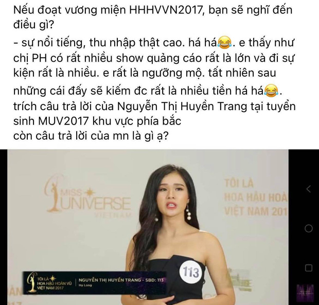 Cụ thể, lúc nhận được câu hỏi: "Khi được hỏi nghĩ đến vương miện Hoa hậu Hoàn vũ, bạn nghĩ đến điều gì?", Huyền Trang đã thẳng thắn chia sẻ: "Sự nổi tiếng, thu nhập thật cao. Vì em thấy như chị Phạm Hương bây giờ có nhiều show quảng cáo rất lớn, đi sự kiện rất nhiều, em rất ngưỡng mộ. Và tất nhiên sau đó thì kiếm được rất nhiều tiền". Câu trả lời của Huyền Trang khiến dàn giám khảo vô cùng bất ngờ.