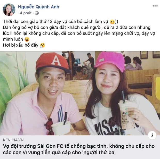 Chiều 24/9, giới cầu thủ Việt xôn xao khi cầu thủ Nguyễn Ngọc Duy - đội trưởng Sài Gòn FC bị vợ tố bạc tình, cặp bồ khi chưa hoàn tất thủ tục ly hôn và còn đưa ra điều khoản không chu cấp cho 2 con chung. Hơn nữa, Nguyễn Minh Trang - vợ Ngọc Duy - còn đưa ra bằng chứng tố cầu thủ sinh năm 1986 đem tiền chu cấp cho "bạn gái mới" và người phụ nữ này còn thường xuyên lên mạng xã hội chê bai, dạy Minh Trang cách làm vợ, làm mẹ. Scandal khiến cộng đồng mạng dậy sóng. Cô nàng Nguyễn Quỳnh Anh, bạn gái hậu vệ Duy Mạnh cũng cảm thấy bất bình và đã lên tiếng chia sẻ góc nhìn về scadal của cầu thủ Ngọc Duy.