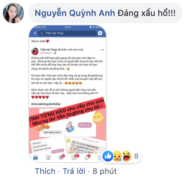 Cụ thể, Quỳnh Anh viết: "Thời đại con gíap thứ 13 dạy vợ của bồ cách làm vợ. Đàn ông bỏ vợ bỏ con giữa đất khách quê người, để ra 2 đứa con nhưng lúc ly hôn lại không chu cấp, để con bồ suốt ngày lên mạng chửi vợ, dạy vợ mình luôn. Hơi bị xấu hổ đấy".