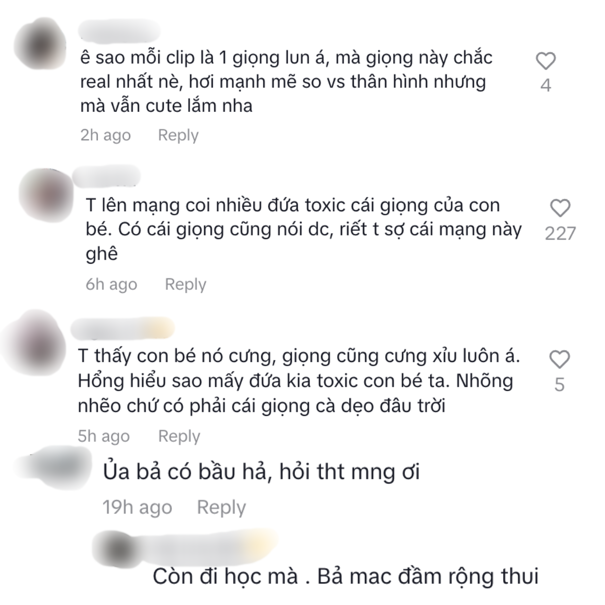 - "Mình lên mạng coi nhiều người toxic giọng nói của con bé. Đúng là hết thứ chê nên mới vậy mà. Người ta livestream nói nhiều nên giọng bị khàn và nặng hơn đó. Tự nhiên chê con bé giả giọng, lúc này lúc kia, nghe mà sợ cộng đồng mạng quá".