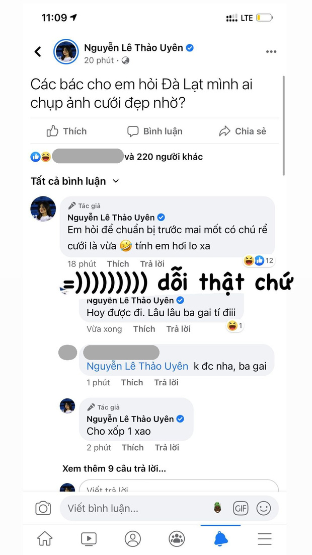 Trên trang cá nhân của mình, Thảo Uyên đăng status: "Các bác cho em hỏi Đà Lạt mình ai chụp ảnh cưới đẹp nhờ?" và nửa đùa nửa thật ở phần comment: "Em hỏi để chuẩn bị trước mai mốt có chú rể cưới là vừa. Tính em lo hơi xa".