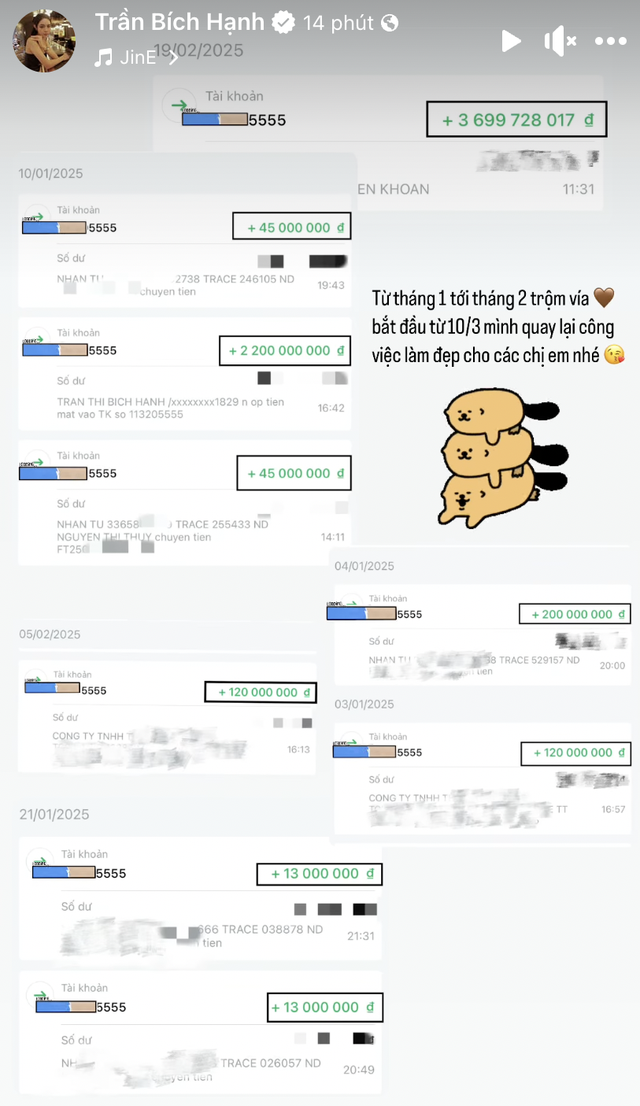 Bích Hạnh được biết đến là nàng WAG kiếm tiền rất giỏi trong làng bóng Việt. Mới đây, cô nàng khoe khoản thu nhập trong tháng 1 và tháng 2. Cộng lại biến động số dư dân tình hoang mang khi chỉ trong vòng 2 tháng Bích Hạnh đã kiếm về hơn 6 tỷ đồng.