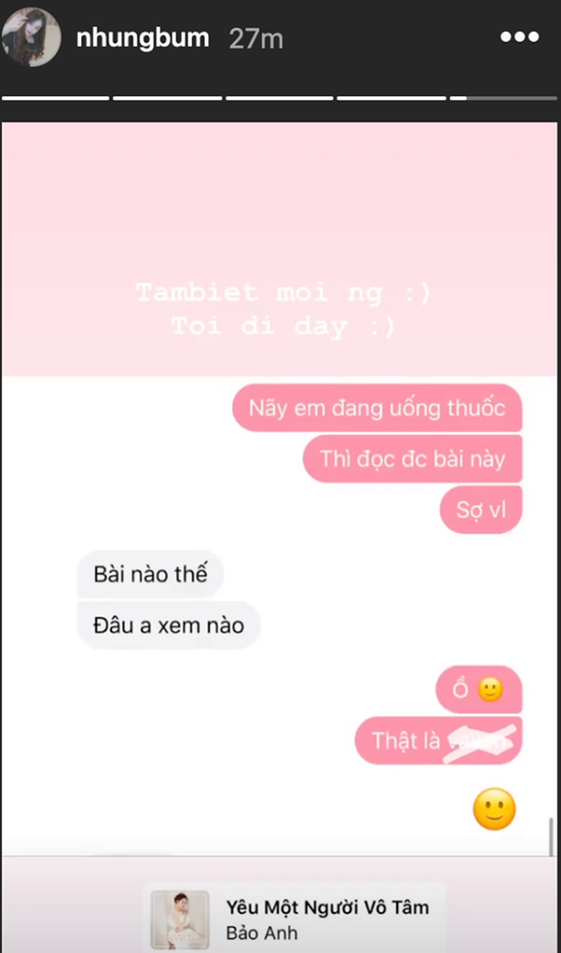 Trang Nhung còn ghép thêm đoạn nhạc trong bản hit nổi tiếng "Yêu một người vô tâm" của ca sĩ Bảo Anh vào tin nhắn với bạn trai. Không biết chàng tiền đạo tội nghiệp đã tìm ra lý do khiến bạn gái mượn lời bài hát để nói lên tâm sự của mình chưa?