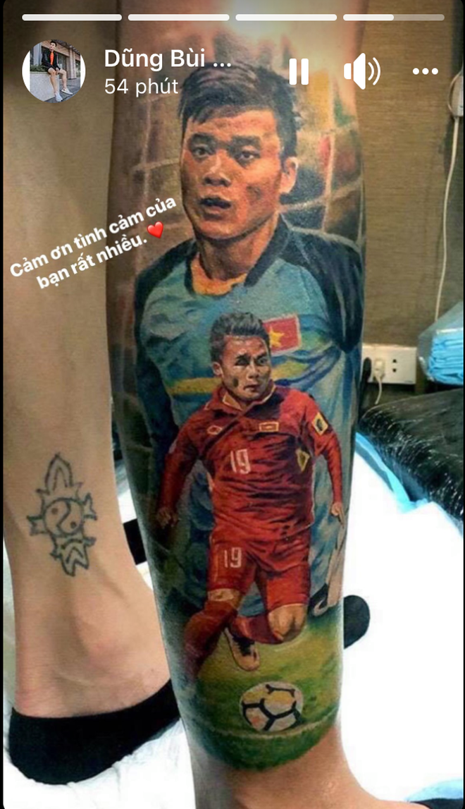 Tối 22/4, trên trang cá nhân, thủ môn Bùi Tiến Dũng đã đăng tải hình ảnh chụp bắp chân xăm hình anh cùng tiền vệ Nguyễn Quang Hải với lời nhắn: "Cảm ơn tình cảm của bạn rất nhiều".