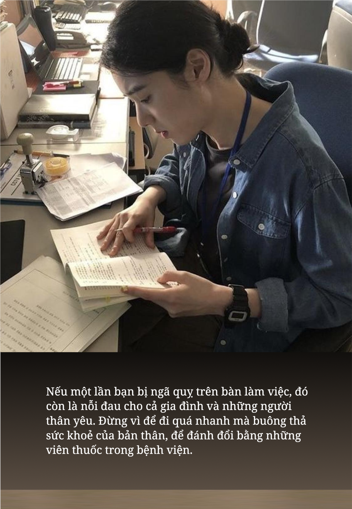 Nếu một lần bạn bị ngã quỵ trên bàn làm việc, đó còn là nỗi đau cho cả gia đình và những người thân yêu. Đừng vì để đi quá nhanh mà buông thả sức khoẻ của bản thân, để đánh đổi bằng những viên thuốc trong bệnh viện.
