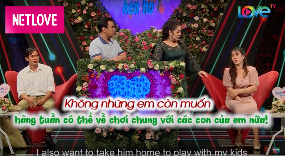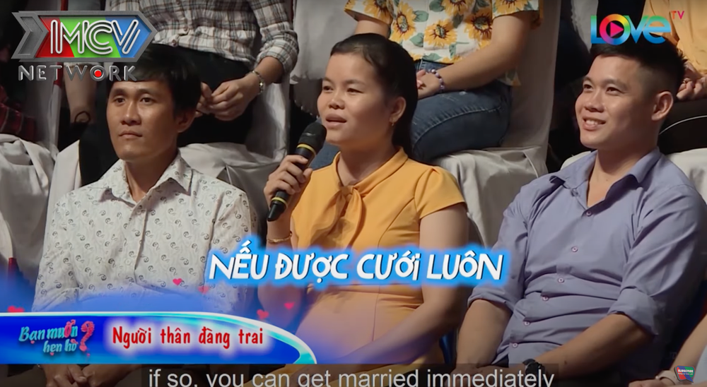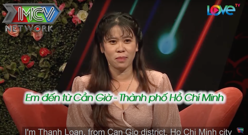 Phía bên kia rèm là chị Nguyễn Thị Thanh Loan (39 tuổi) làm việc tại nhà thiếu nhi huyện Cần Giờ, thành phố Hồ Chí Minh. Đàng gái ghi điểm tuyệt đối với vẻ ngoài hiền dịu, cách nói chuyện gần gũi. Cặp đôi được "ông mai bà mối" hết lời khen ngợi có nét phu thê.