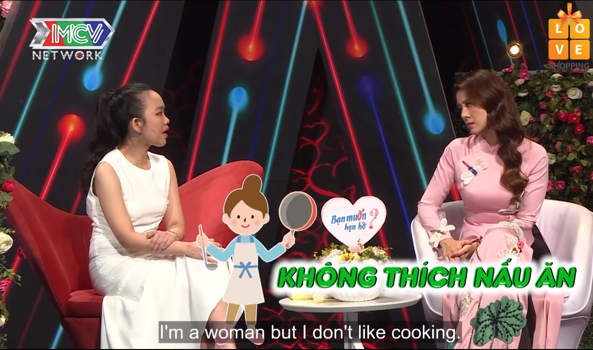 Chưa hết cô gái còn gây ngán ngẩm cho khán giả khi giới thiệu mình nóng tính, mít ướt, trẻ con và đặc biệt là "phụ nữ nhưng mà em lại không thích nấu ăn, đặc biệt rất là ham ăn và ăn rất nhiều".