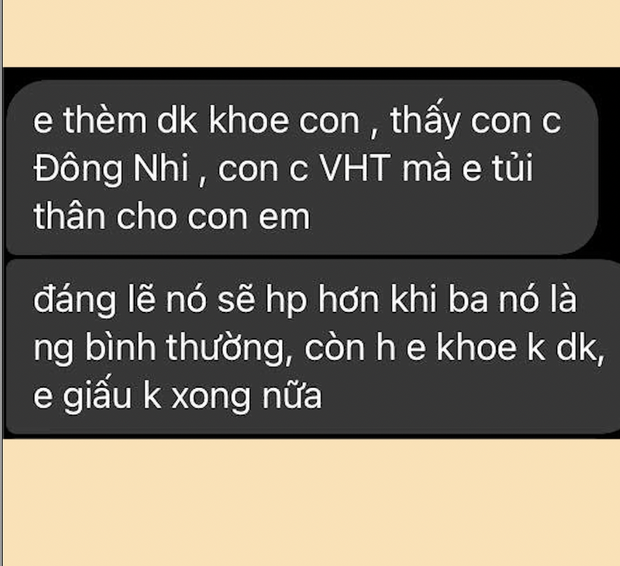 Nội dung tin nhắn như sau: Em thèm được khoe con, thấy con chị Đông Nhi, con chị Võ Hạ Trâm mà em tủi thân cho con em. Đáng lẽ nó sẽ hạnh phúc hơn khi ba nó là người bình thường. Còn giờ em khoe không được, em giấu không xong nữa.