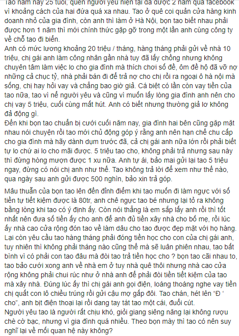 Anh có mức lương khoảng 20 triệu/tháng, hàng tháng phải gửi về nhà 10 triệu, chị gái anh làm công nhân gần nhà tuy đã lấy chồng nhưng không chuyên tâm làm việc lo cho gia đình mà thích chơi số đề, ôm đề hộ đã vỡ nợ những cả chục tỷ, nhà phải bán đi để trả nợ cho chị rồi ra ngoại ô hà nội mà sống, chị hay hỏi vay và chẳng bao giờ giả. Cá biệt có lần còn vay tiền của mình nữa, mình vì nể người yêu và cũng vì muốn lấy lòng gia đình anh nên cho chị vay 5 triệu, cuối cùng mất hút. Anh có biết nhưng thường giả lơ không đả động gì.