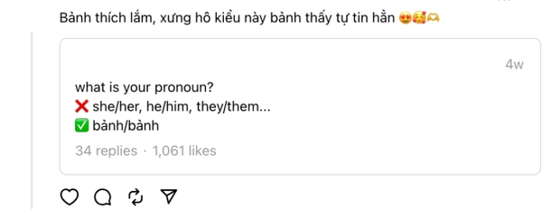 Dần dần, phong trào gọi nhau bằng 1 danh xưng nào đó mình yêu thích trên Threads được lan truyền mạnh mẽ. Hội người dùng Threads cho biết, khi sử dụng MXH này thì không cần ngại ngùng gì hết, dù là người hướng nội hay ngại giao tiếp thì chỉ cần xưng hô "bảnh", "thắm",... đều thấy dễ chịu, vừa đáng yêu lại không phân biệt tuổi tác, vùng miền, hay quan tâm đến danh tính.