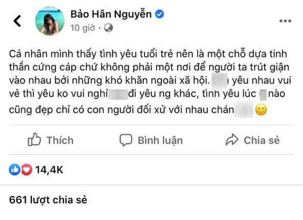 Theo đó, cô nàng 2k thể hiện rõ quan điểm bộc trực về tình yêu: "Yêu nhau vui vẻ thì yêu, không vui nghỉ đi yêu người khác". Bảo Hân cũng cho rằng tình yêu vốn dĩ đã đẹp chỉ có con người đối xử với nhau mới chán. Không biết tình trường của Bảo Hân đã cho cô những kinh nghiệm như thế nào, nhưng xem ra, dân tình khá là đồng ý với quan điểm đó.