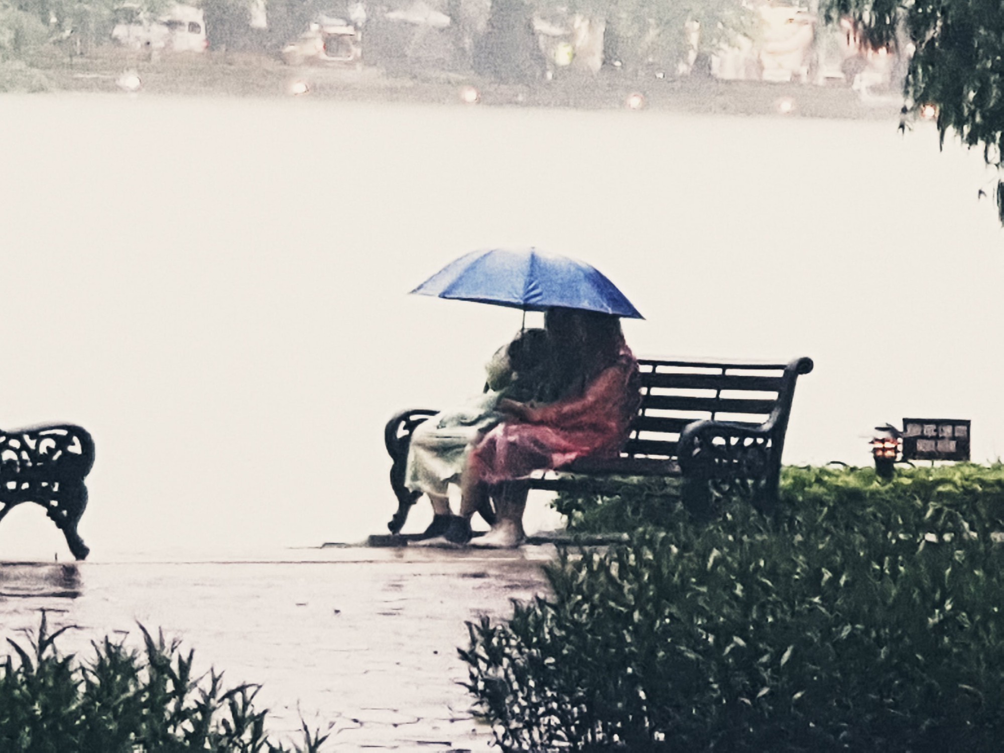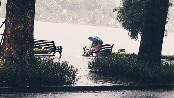 Cụ thể, một tài khoản facebook có tên H.P đã chứng kiến, chia sẻ: "Khi yêu người ta sẽ làm những việc điên rồ. Hồ Gươm chiều hôm qua. Mưa siêu to, khổng lồ mà 2 bạn trẻ vẫn ngồi đấy nắm tay nhau gần 1 tiếng."