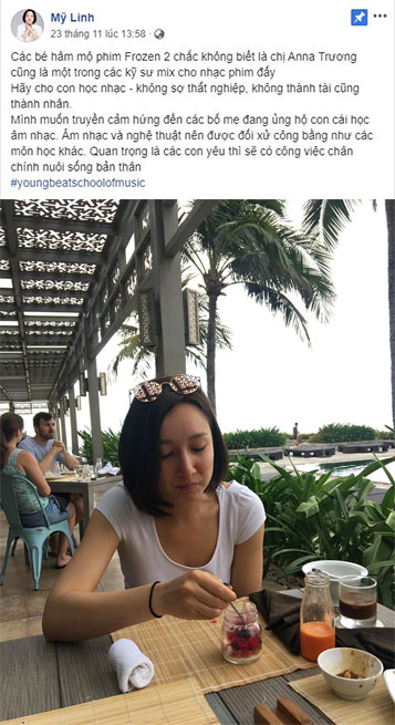 Bên dưới bài đăng của Mỹ Linh, Anna Trương cũng vào giải thích cặn kẽ về vai trò của mình trong quá trình sản xuất bộ phim: "Con cảm ơn mẹ! Nhưng mà con phải giải thích rõ hơn là con không phải người mix phim nhé! Và trong một bộ phim có rất nhiều kỹ sư mix. Lần này con mix và edit nhạc của 10 thứ tiếng (trong đó có cả Frozen tiếng Việt)".