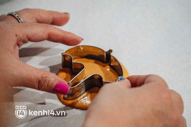 Đợi một lúc khi kẹo bắt đầu keo lại thì đặt khuôn lên, ấn hờ để tạo viền. Thế là bạn đã có một chiếc kẹo đường giống trong Squid Game!