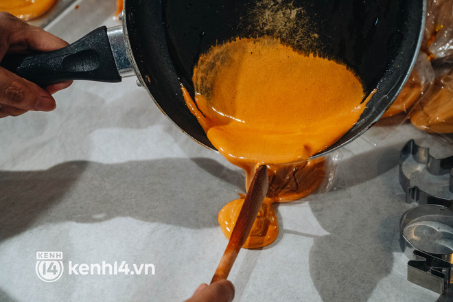 Bước đầu tiên, người làm cho đường lên chảo đun nóng chảy ở nhiệt độ thấp. Sau đó, nhấc chảo lên khỏi bếp, cho một chút baking soda vào rồi khuấy đều. Hỗn hợp sẽ đặc và đục hơn, được đổ ra một mặt phẳng hoặc khuôn tròn rồi dàn ra.