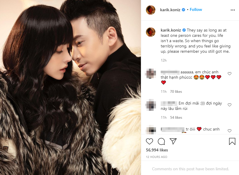 Tối 24/8, Karik thu hút đông đảo sự chú ý khi lần đầu công khai bạn gái trên trang cá nhân. Anh đính kèm dòng chú thích cực tình: They say as long as at least one person cares for you, life isn’t a waste. So when things go terribly wrong, and you feel like giving up, please remember you still got me". (Tạm dịnh: Người ta nói, cuộc sống của bạn không hề lãng phí miễn là có ít nhất một người quan tâm đến bạn. Vì vậy khi mọi thứ đi lệch hướng đến mức tồi tệ, và em muốn bỏ buộc, hãy nhớ rằng em luôn có anh ở bên).