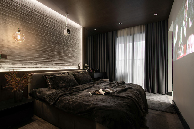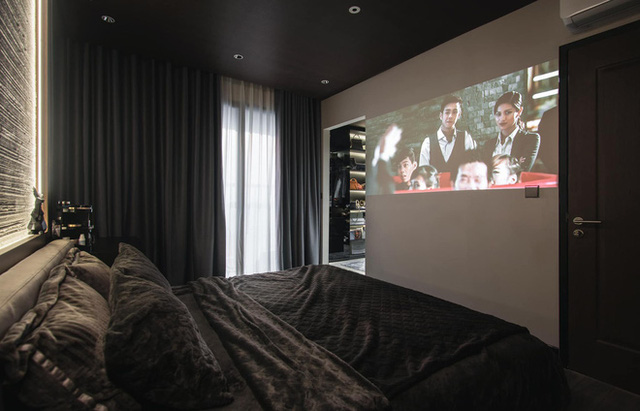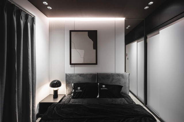 Phòng ngủ của Mai Phương Bùi không hề cầu kì, diêm giúa như các cô gái khác mà vô cùng đơn giản và tinh tế với hai tông màu chủ đạo là trắng - đen. Bên cạnh phòng ngủ là phòng đựng quần áo, túi xách được sắp xếp ngăn nắp.
