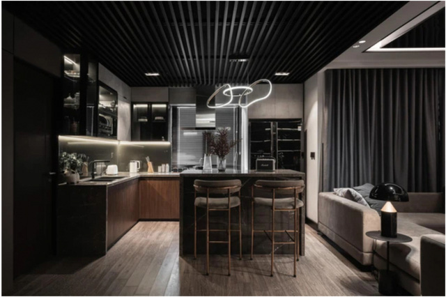 Từ phòng khách cho tới phòng bếp, hot girl đều chăm chút những góc nhỏ. Chẳng hạn như trong phòng khách, tủ đựng rượu tăng thêm phần "sang chảnh", từng ô nhỏ được lấp đầy bằng các chai rượu và vật trang trí. Hoặc trong phòng bếp, đèn vòng lạ mắt là điểm nhấn của căn phòng. Trong các không gian của căn hộ, hệ thống đèn được tận dụng triệt để làm đồ trang trí lạ mắt.