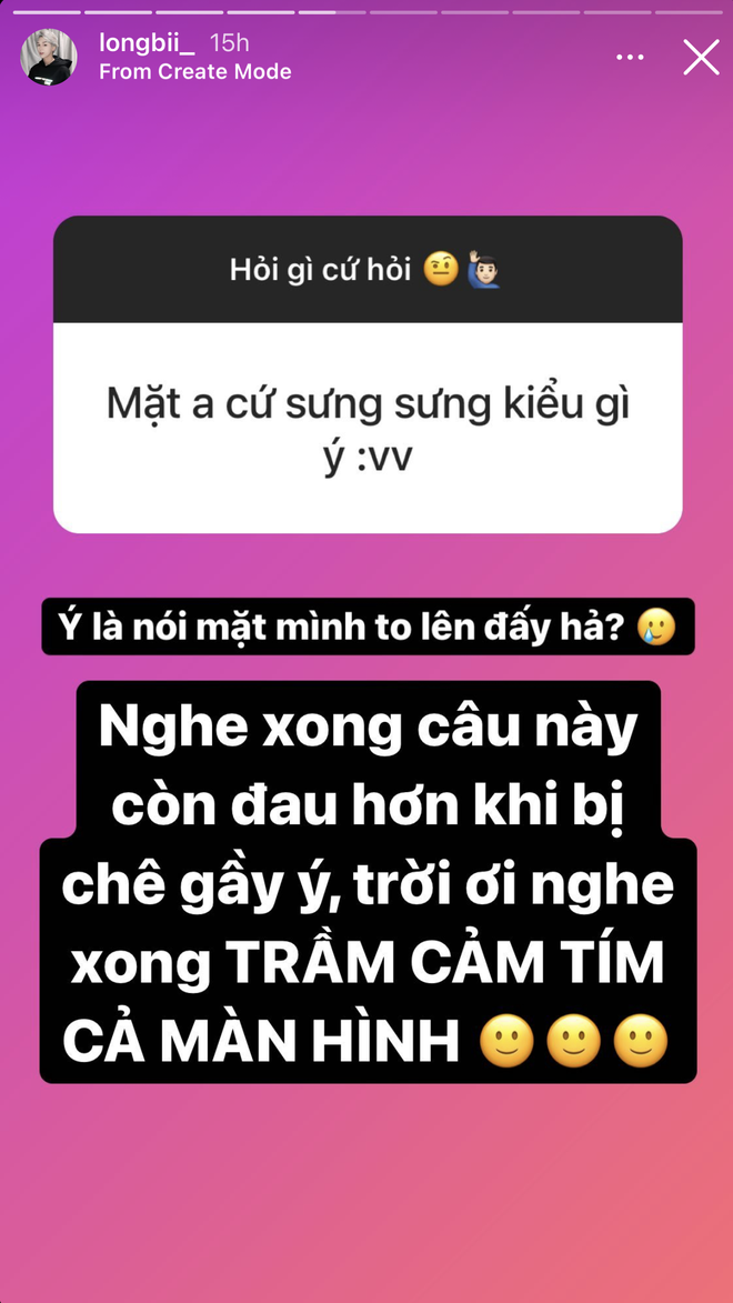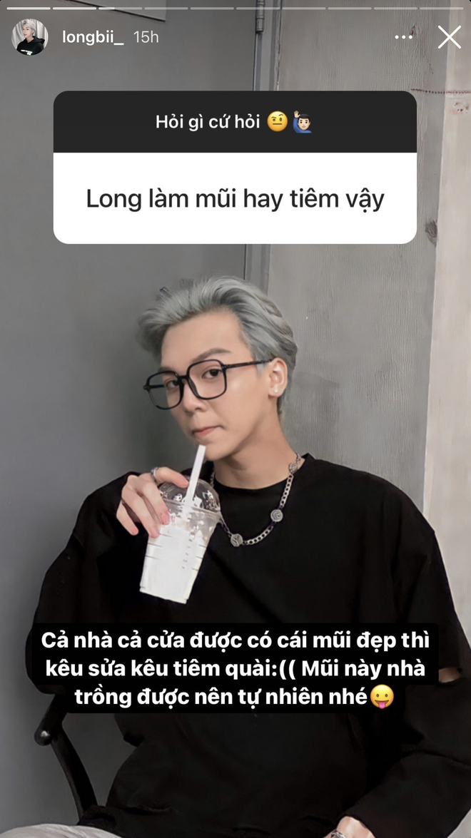 Mới đây, những thắc mắc ấy tiếp tục được đặt ra khi Long Bi chơi trò Q&A trên Instagram. Không ít câu hỏi có liên quan đến vấn đề này đã xuất hiện. Người thì hỏi thẳng: "Long làm mũi hay tiêm vậy?", người thì nhắc kheo khéo: "Mặt anh cứ sưng sưng kiểu gì"...