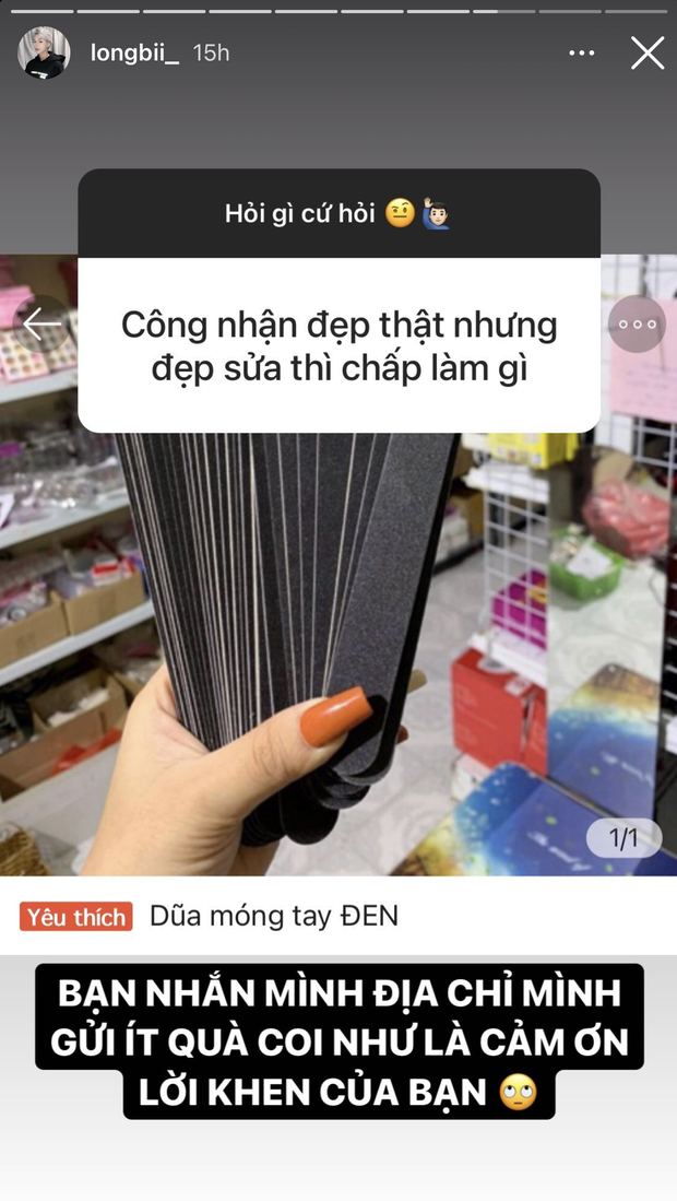 Đặc biệt, có một ý kiến thẳng thắn cho rằng Long Bi hiện tại đẹp trai thật nhưng đẹp do PTTM nên chẳng có gì đáng để khen. Riêng với bình luận này, Long Bi lại tỏ ra "đanh đá" hơn hẳn. Cậu bạn gửi lại người đặt câu hỏi hình... chiếc dũa với hàm ý gì thì ai cũng hiểu.