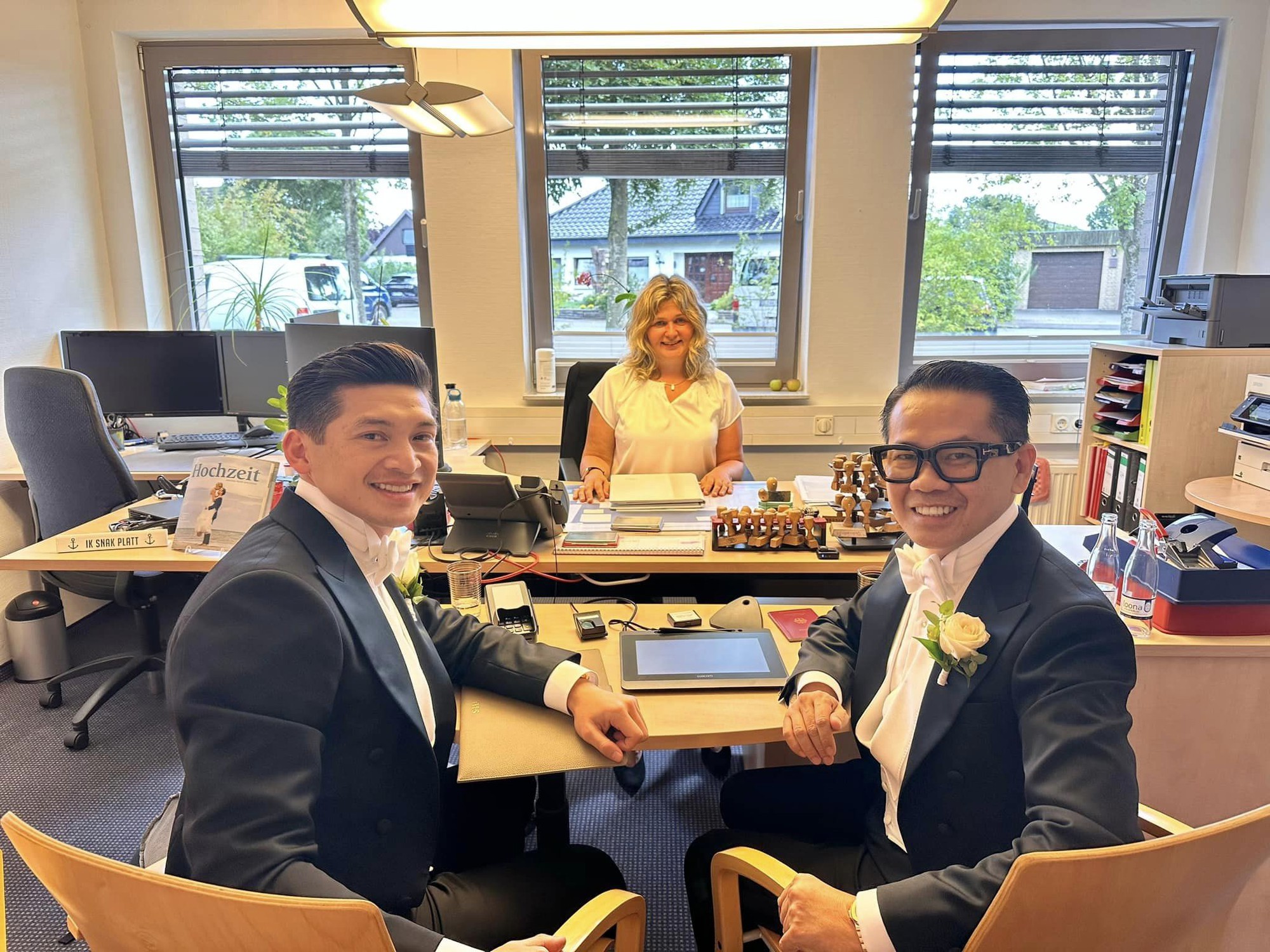 Mới đây, NTK Thái Công chia sẻ trên trang cá nhân Facebook của mình việc anh và bạn trai Huy Yves đã chính thức kết hôn và được chính quyền Đức công nhận, cấp giấy hôn thú.