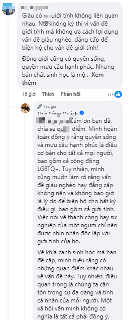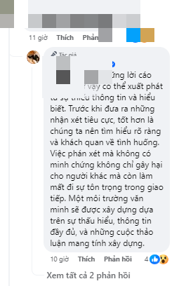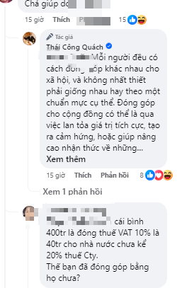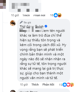 NTK Thái Công đã trực tiếp phản hồi từng bình luận. Anh thẳng thắn chia sẻ quan điểm của bản thân một cách lịch sự, tinh tế với nhiều góc nhìn đa chiều, khách quan. Hành động văn minh, thái độ khiêm tốn của anh nhận được nhiều lời ngợi khen và sự ngưỡng mộ, kính nể.