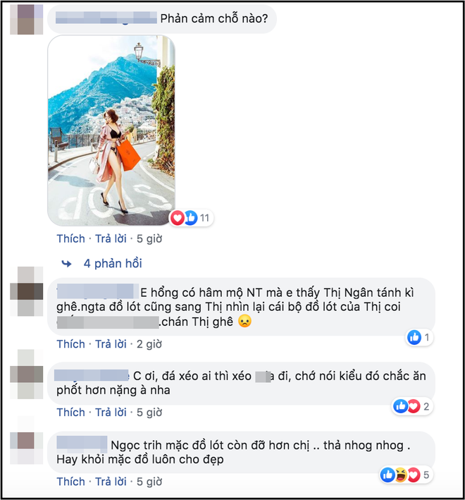 Dù không chỉ đích danh tên ai nhưng chia sẻ này của Ngân 98 đã làm nhiều khán giả khẳng định cô đang ngầm "đá xéo" đến bộ ảnh diện bikini đi shopping tại Ý của Ngọc Trinh mới đây. Ở phần bình luận dòng trạng thái, rất đông khán giả đã để lại nhiều ý kiến bày tỏ sự bức xúc, thậm chí chỉ trích Ngân 98, cho rằng cô không thể so sánh bộ ảnh phản cảm của mình với loạt ảnh bikini của Ngọc Trinh. Tuy nhiên mặc cho việc bị dân mạng đồng loạt "tổng tấn công", Ngân 98 vẫn giữ nguyên chia sẻ ẩn ý này trên trang cá nhân và tỏ thái độ khá bình thản.