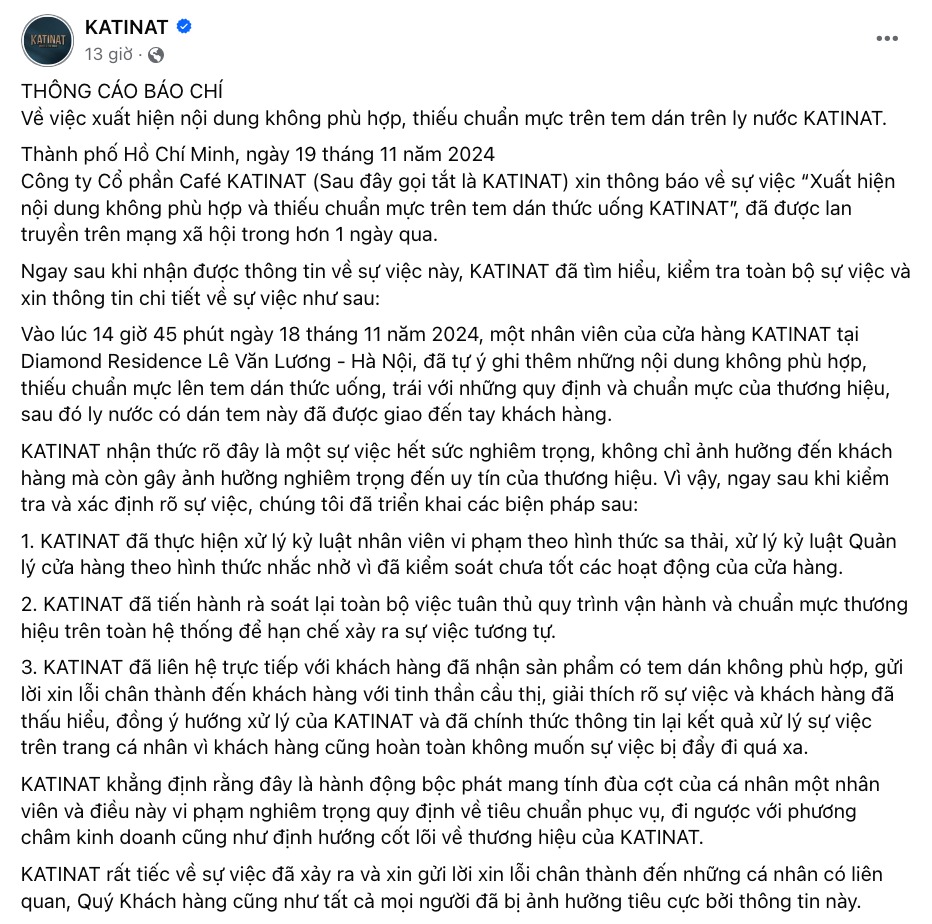 Theo đó, Công ty Cổ phần Café KATINAT (gọi tắt là Katinat) cho biết đã tìm hiểu, kiểm tra toàn bộ sự việc và thông tin chi tiết về sự việc như sau: "Vào lúc 14h45 ngày 18/11, một nhân viên của cửa hàng Katinat tại Diamond Residence Lê Văn Lương (Hà Nội) đã tự ý ghi thêm những nội dung không phù hợp, thiếu chuẩn mực lên tem dán thức uống, trái với những quy định và chuẩn mực của thương hiệu, sau đó ly nước có dán tem này đã được giao đến tay khách hàng".