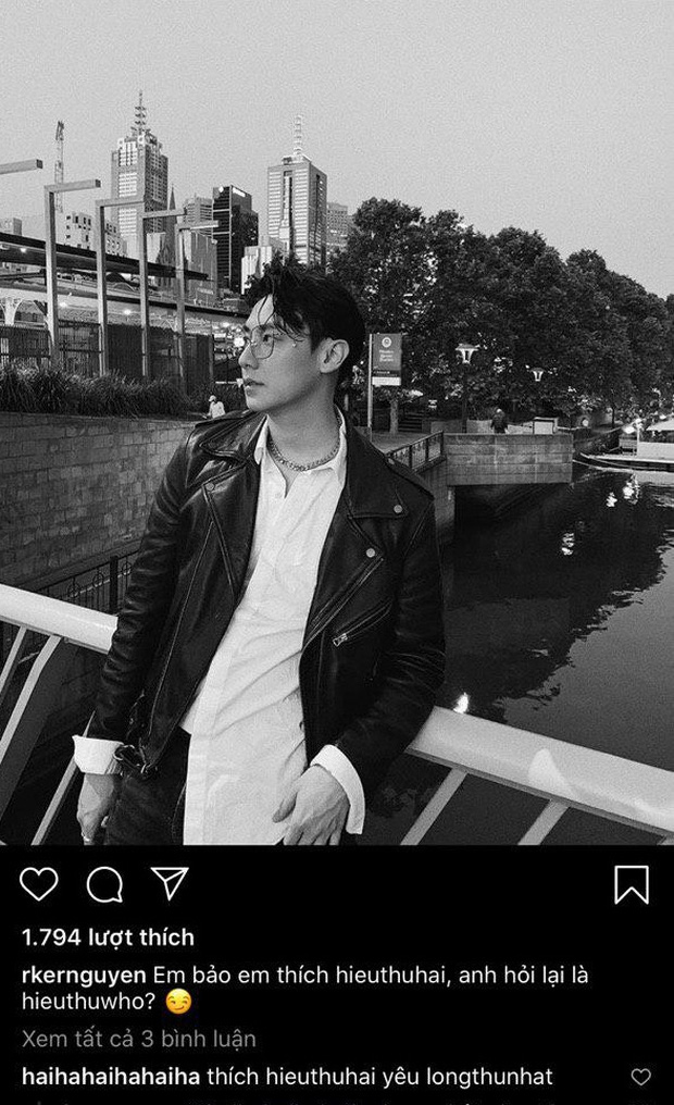 Phía dưới comment, Hải Hà đã nhảy số cực nhanh, lém lỉnh đáp: "Thích HIEUTHUHAI nhưng yêu Longthunhat". Thế là hoà nhé, anh yêu Rocker vẫn là số 1 trong lòng bạn gái nhé, còn chuyện thích HIEUTHUHAI thì vẫn... thích thôi.