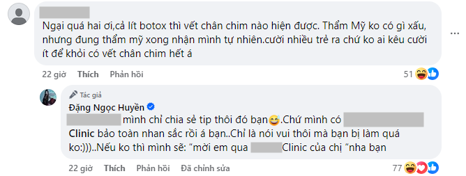 “Ngại quá hai ơi, cả lít botox thì vết chân chim nào hiện được. Thẩm mỹ không có gì xấu, nhưng đừng thẩm mỹ xong nhận mình tự nhiên. Cười nhiều trẻ ra chứ không ai kêu cười ít để khỏi có vết chân chim hết á” - cư dân mạng này nói.