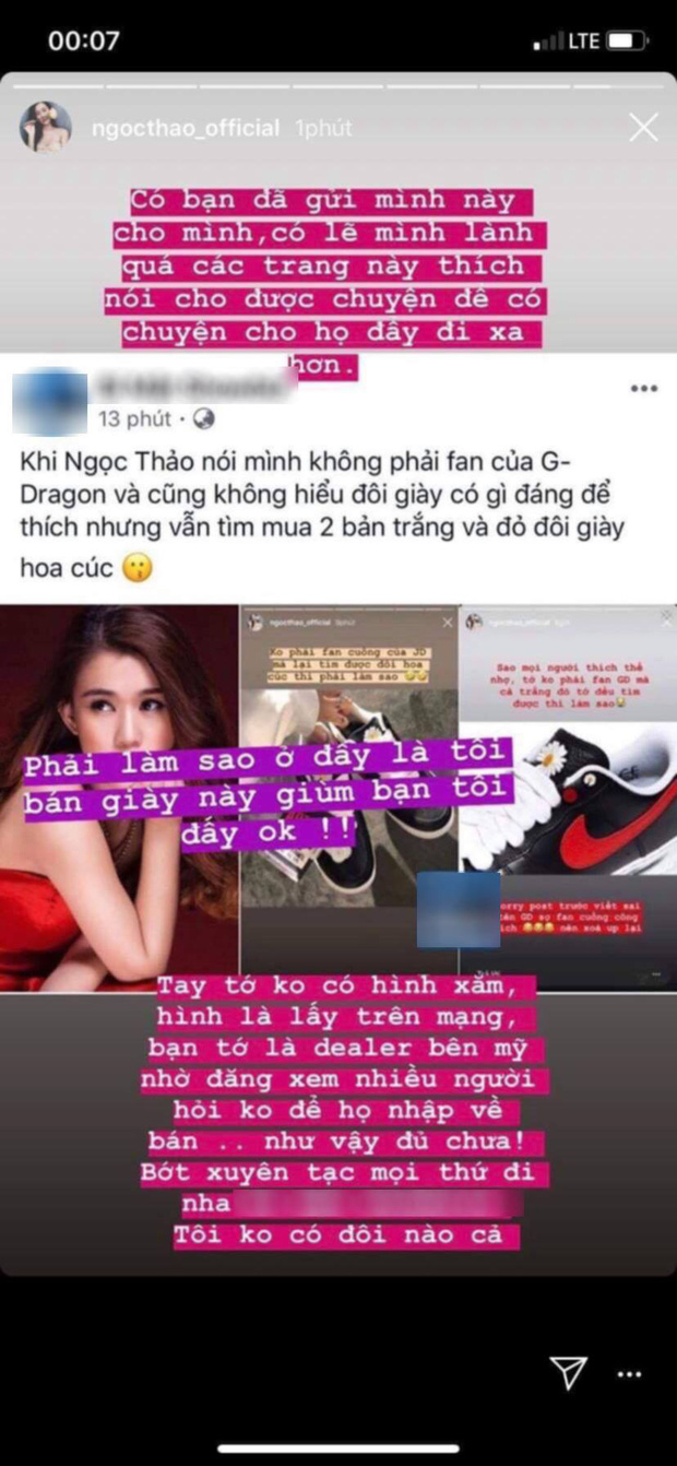 Trước cơn bão dư luận, Ngọc Thảo đã lên tiếng giải thích. Cô cho rằng sự việc đang được đẩy đi quá xa và cho biết mình không có đôi giày nào cả, chỉ đăng hình lấy trên mạng để giúp bạn là dealer ở Mỹ thăm dò xem có nhiều người thích không mà thôi.