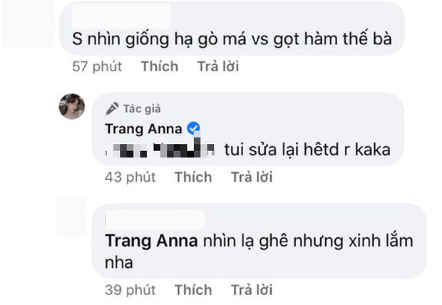 Tuy nhiên, mọi đồn đoán đã được làm sáng tỏ khi một dân mạng đem thắc mắc này đi hỏi chính chủ ngay dưới bài đăng của cô nàng rằng: "Sao nhìn giống hạ gò má với gọt hàm thế bà" thì Trang Anna không ngần ngại thừa nhận: "Tui sửa lại hết rồi".