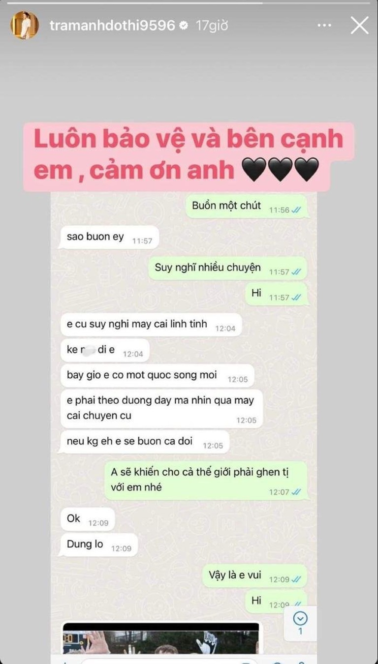 Điều này đã khiến nàng hotgirl "Nóng cùng World Cup" không khỏi buồn phiền. Ngay sau đó, cô cũng nhắn tin để than thở với bạn trai và được động viên rất nhiều. Chính hành động này của bạn trai đã khiến Trâm Anh vui vẻ trở lại. Trâm Anh đã nhanh chóng chia sẻ lại hình ảnh đoạn tin nhắn giữa cô và bạn trai kèm theo dòng trạng thái: "Luôn bảo vệ và bên cạnh em. Cảm ơn anh!".