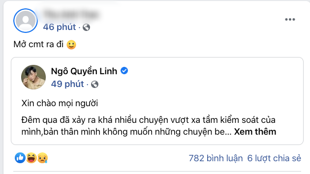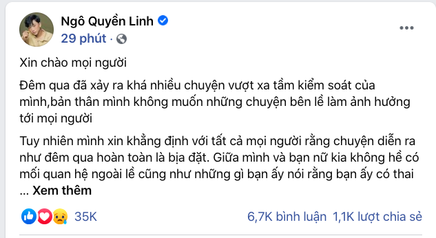 Một đêm sau khi bài bóc phốt được đăng tải, Ngô Quyền Linh cũng có câu trả lời trên fanpage 1,4 triệu theo dõi. Theo đó, anh chàng này khẳng định sự việc vượt xa tầm kiểm soát.