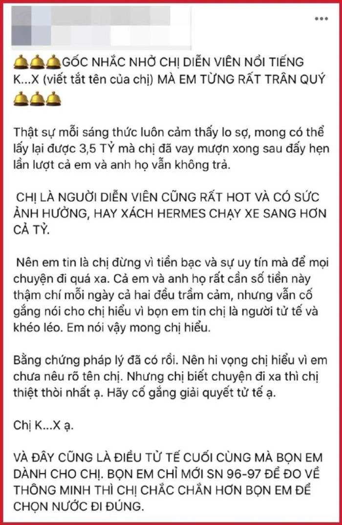 Chiều tối ngày 25/4, mạng xã hội xôn xao trước bài viết tố một nữ diễn viên có tên viết tắt là K.X nợ 3,5 tỷ nhưng hẹn mãi không trả.