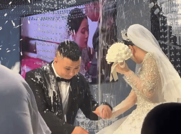 Theo đó khi cô dâu và chú rể mới chuẩn bị bước lên sân khấu để làm các nghi thức bắt đầu đám cưới thì một người bạn đã xịt sâm panh vào mặt 2 vợ chồng. Trước hành động này, chú rể vừa cười vừa cúi mặt để tránh bọt còn cô dâu phải dùng hoa cưới để che mặt nhưng trang phục của cả 2 bị dính bọt vương vãi.