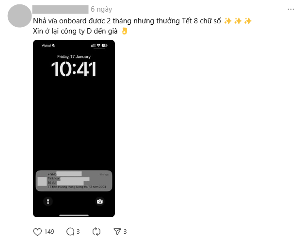 Về phía những người đã nhận thưởng Tết, ngoài màn khoe lương thưởng, họ cũng không quên flex công ty đãi ngộ tốt, hứa cống hiến hết đời. Không biết lời hứa được thực hiện đến bao giờ nhưng ra Tết không nghỉ việc là chắc chắn rồi!