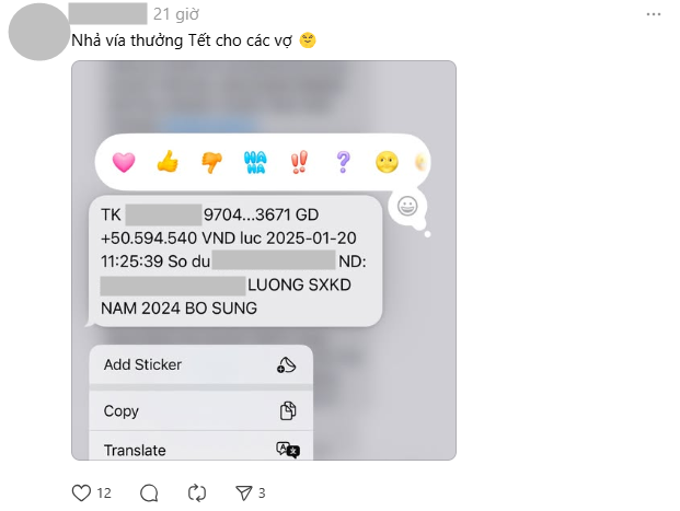 Lướt vài vòng MXH là thấy những pha chụp ảnh màn hình biến động số dư do lương/ thưởng Tết đáng ghen tị, ít thì dăm bảy triệu hay hơn chục triệu, nhiều thì lên đến 50 - 60 triệu đồng hay cả trăm triệu đồng cũng có. Thậm chí có người còn hoài nghi vì đó là những con số quá cao, là mơ ước của rất nhiều người.