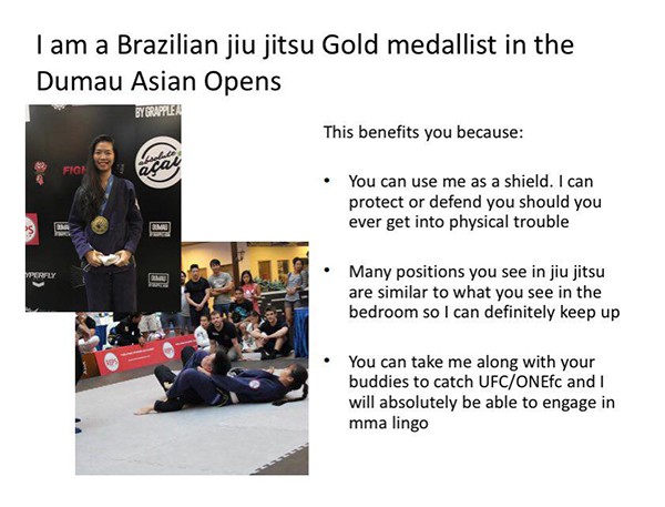Cho hay mình là người giỏi võ, có thể áp dụng võ thuật vào chuyện giường chiếu và bảo vệ người yêu nếu có điều bất trắc xảy ra...