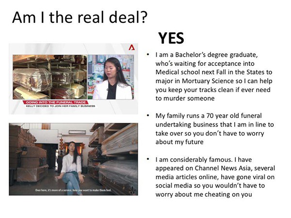 Kết quả là gì? Bài thuyết trình đầy tính thuyết phục này đã giúp Kelly có thêm tới 60% lượt quẹt phải trên các ứng dụng hẹn hò nổi tiếng, thậm chí còn đứng top 10 "quẹt phải" trên Paktor. Thậm chí, nhiều anh đàn ông còn thú nhận, profile của Kelly khiến họ thích thú trong... sợ hãi.