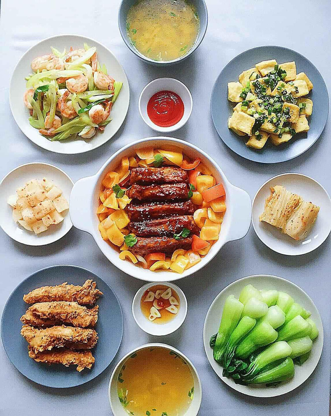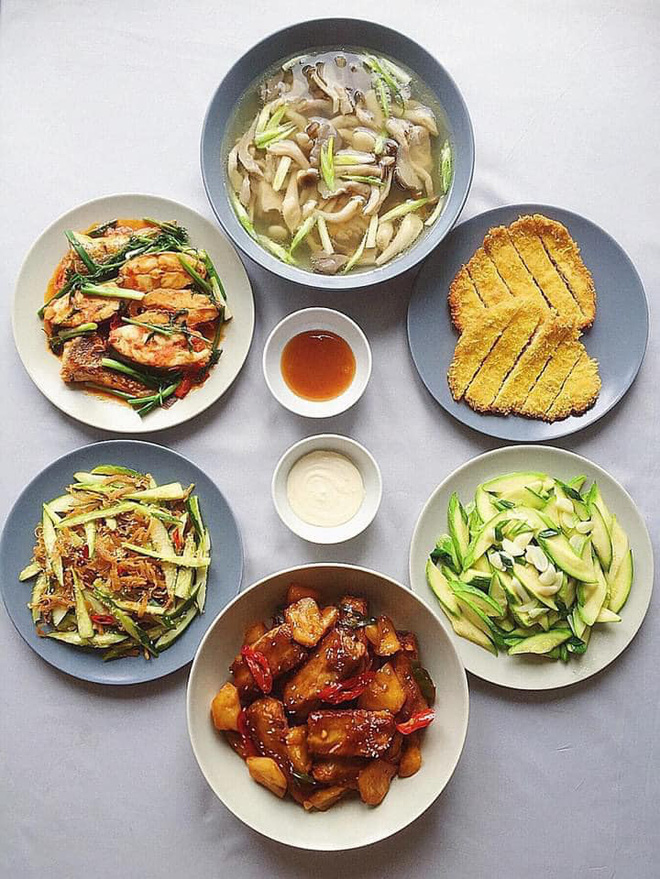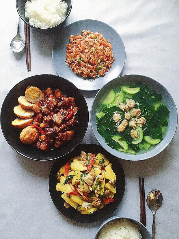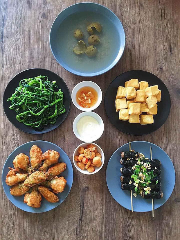 Cô chia sẻ: "Ví dụ mâm cơm có: thịt kho trứng, rau luộc, đậu chiên tẩm hành chẳng hạn, đâu có đắt đúng không, nhưng đậu chiên vàng, thịt kho màu đẹp, mềm, tròn vị, rau luộc thật xanh, vậy là có 1 mâm cơm đẹp mắt và ngon rồi!".